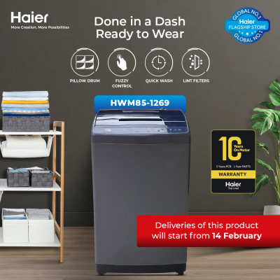 HWM 85-1269S6-Haier-8.5 kg-Fully Automatic-Top Loading Washing Machine-Pillow Drum-Quick Wash-Dual Lint Filters-10 Years Warranty