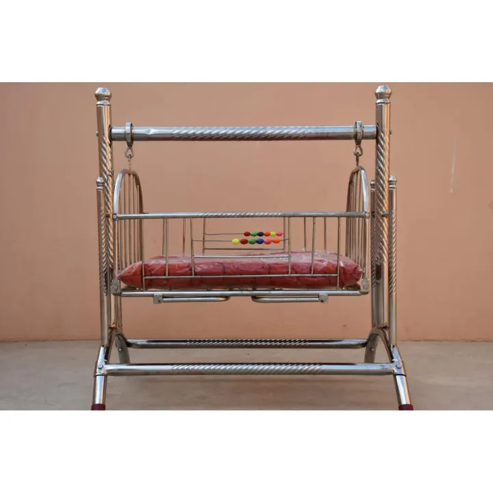 New%20Born%20Baby%20Silver%20Chrome%20Baby%20Swinging%20Cradle%20with%20Soft%20Mattress%20Bed%20-%20Image%201