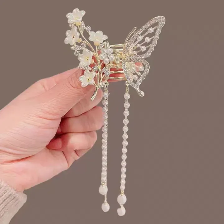 Crystal Rhinestone Butterfly Pearl Tassel Hairpin - Alloy Side Clip for Women and Girls