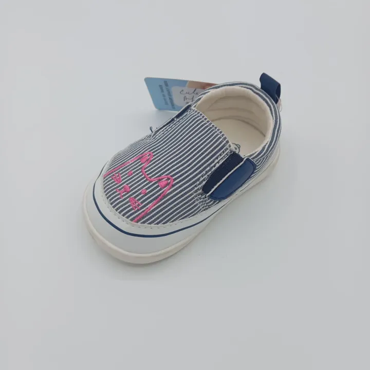 Navy Blue Striped Canvas Baby Slip-On Shoes | Soft Sole Infant Sneakers with Cute Pink Bunny Design
