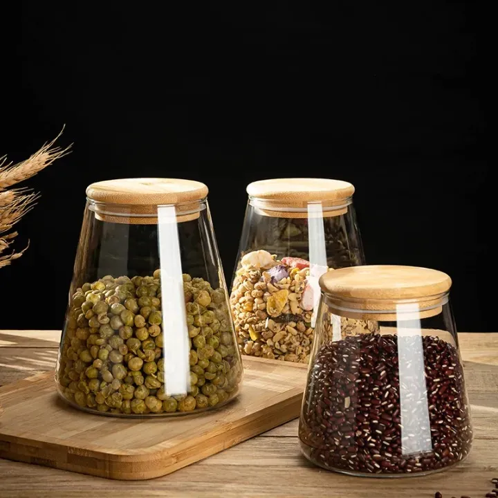 1- Piece [ 550ml | 750ml | 950ml ] Borosilicate Glass Bottles with Wood Lid Kitchen Storage Glass Airtight Canister Jars Food Container Coffee Beans