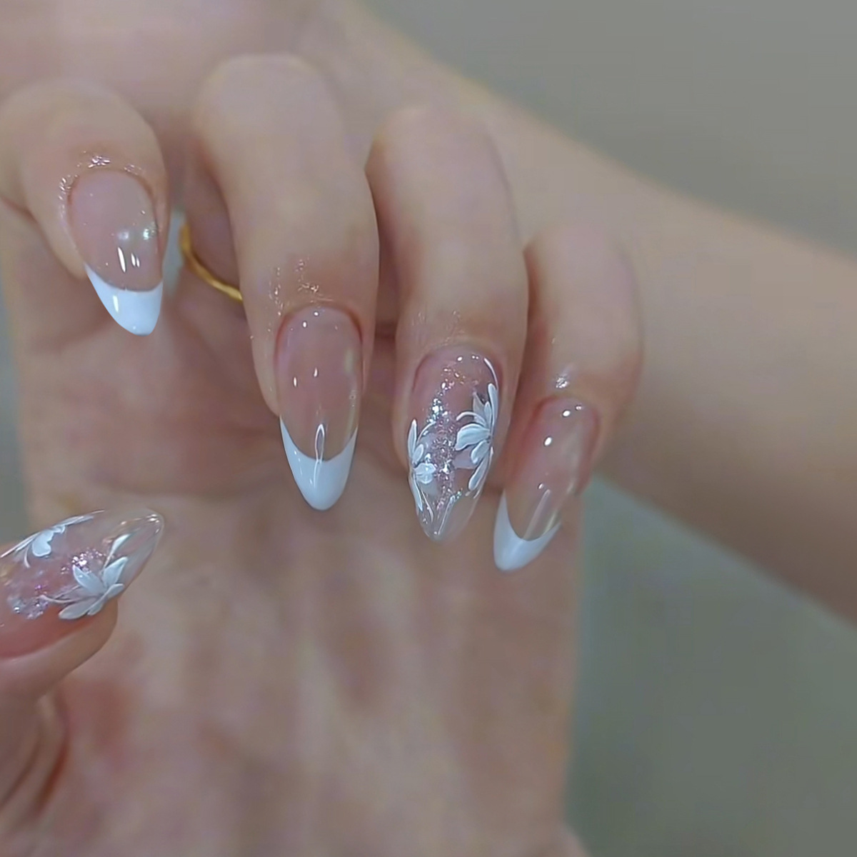 24pcs white color flower long pointed False Nails With Glue Sticker Elegant Art Wearable Beautiful Press On Artificial Nails For Girl Women