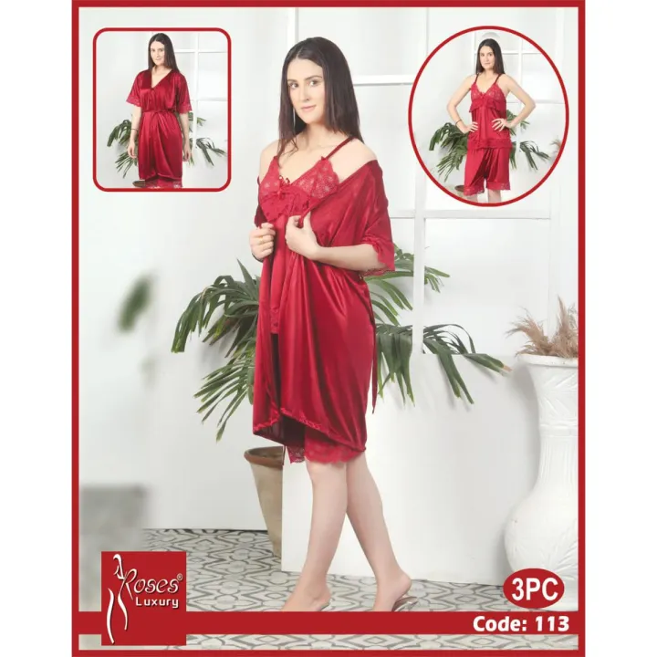 3%20Pcs%20Maroon%20Satin%20Silk%20Long%20Gown%20Set%20for%20Women%20Ladies%20Sleepwear%20Night%20Dress%20For%20Women%20-%20Image%201