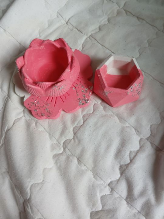 3 pices set (lotus vase and dimond shape vase with dish) hand made pink nd whit clour