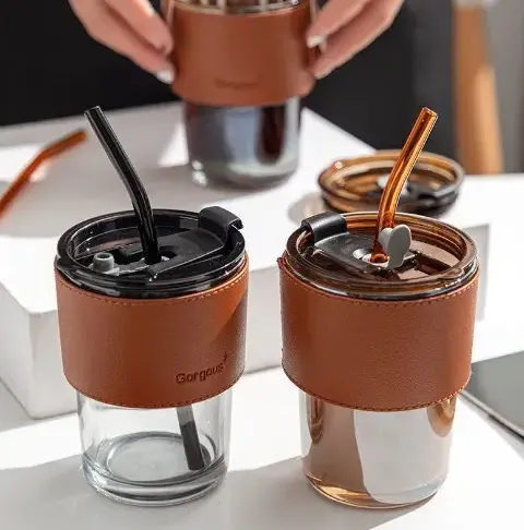 450ml Coffee Glass Mug Cups with Lids and Straws with Leather Sleeve