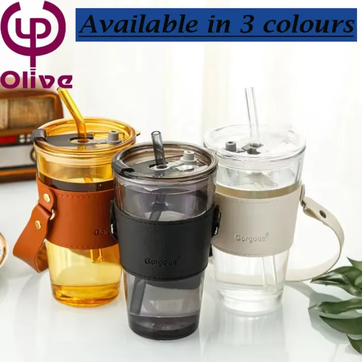 450ml Glass Tumbler with Straw, Lid & Leather Sleeve, Reusable Coffee Mug for direct drinking, Mug for Fruit Juice and Milk Shake Coffee Cup