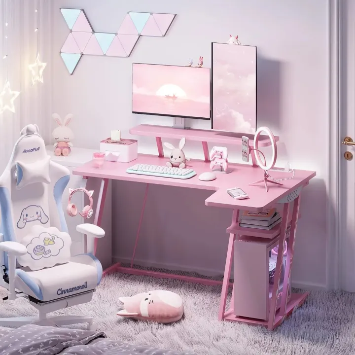 48 Inch L-Shaped Gaming Desk, Smooth Surface& Power Outlets Black - Pink - White (Customised)