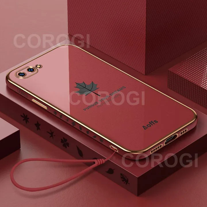 For OPPO A3s Cover + Wrist Strap Fashion Shiny Maple leaf Plating Square Bumper Phone Case Soft TPU Silicone Shockproof Protective Back Cover