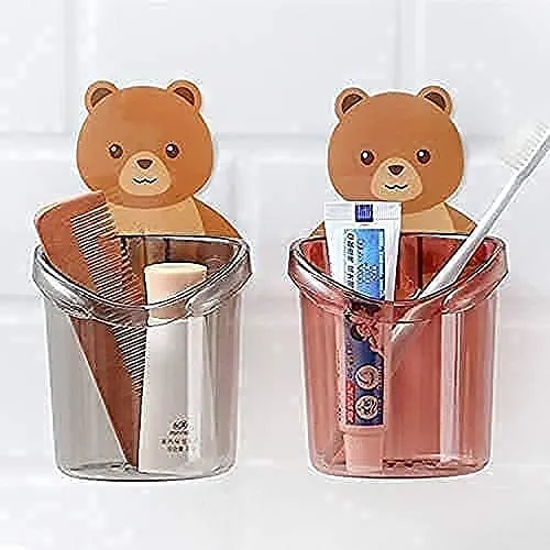 Self Adhesive Plastic Wall Mounted Multipurpose Teddy Bear Toothbrush Holder Cup, ABS Plastic with Strong Adhesive Sticker, Easy Installation for Keeping Toothpaste, Cream, Lotion & Shampoo