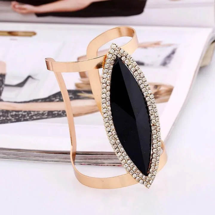 Bachat Express Metal Bangles Women Adjustable Black Stone Golden Gold Color Zircon Trendy Resin Mosaic Crystal Bracelet Smooth Wide Opening Adjustable Bangle