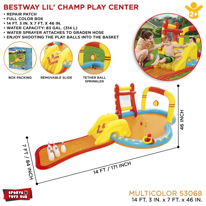 Bestway%2053068%20Lil'%20Champ%20Play%20Center%20Inflate%20Champ%20Paddling%20Pool%20Inflatable%20Kids%20Bowling%20With%20Slide%20Sprayer%20Basketball%20Comfort%20Children%20Multiple%20Activities%204.35m%20X%202.13m%20X%201.17m%20-%20Image%201