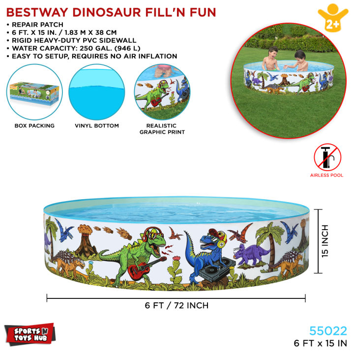Bestway 6 Feet Fill n Fun Air Less Swimming Pool - Without Air 6ft 55022 Dinosaur Kids Play Pool for Summers, Water Games Outdoor & Indoor Pools, Snap Set Water Tub, Summer Gift for Boys & Girls, Best way Swim Pools for Kids, Imported PVC Vinyl Branded