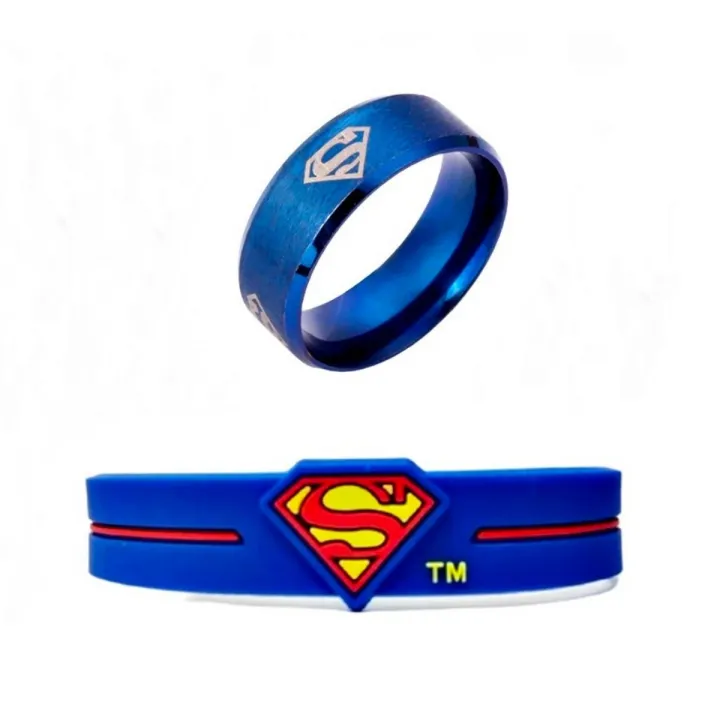 Black And Blue Deal of 2 Superman Logo Rings With Free Superman Band Rubber Bracelets one size, ring size, 17, 18, 19, 20, 21