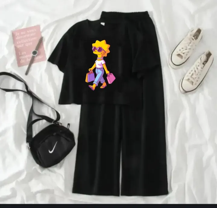 Black Lisa Simpson Printed Cotton Half Sleeves O Neck T Shirt & Flapper Trouser Tracksuit For Women