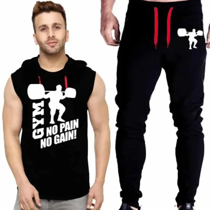 Black No Pain No Gain Gym Printed Summer Hooded Sleeveless Tracksuit for Mens (Hooded Tshirt + Trouser )
