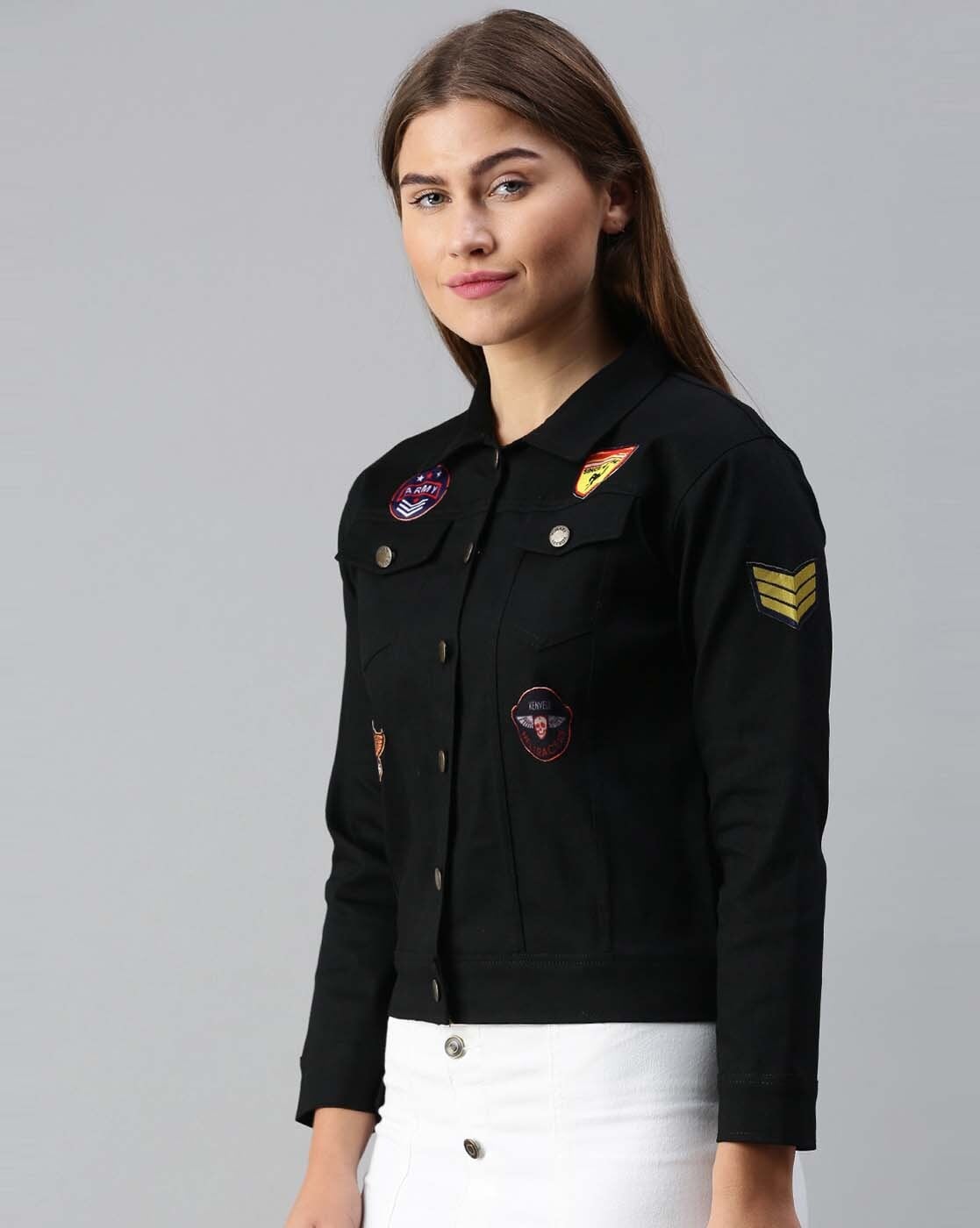 Button Down Women Black Denim Jacket With Badges by Knockout Denims