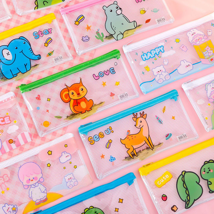 Cartoon Cute Animal Pencil Case Mesh Pen Bag Kawaii Storage Pouch Simple Pvc Waterproof Transparent Pencil Bag Stationery Office School Supplies