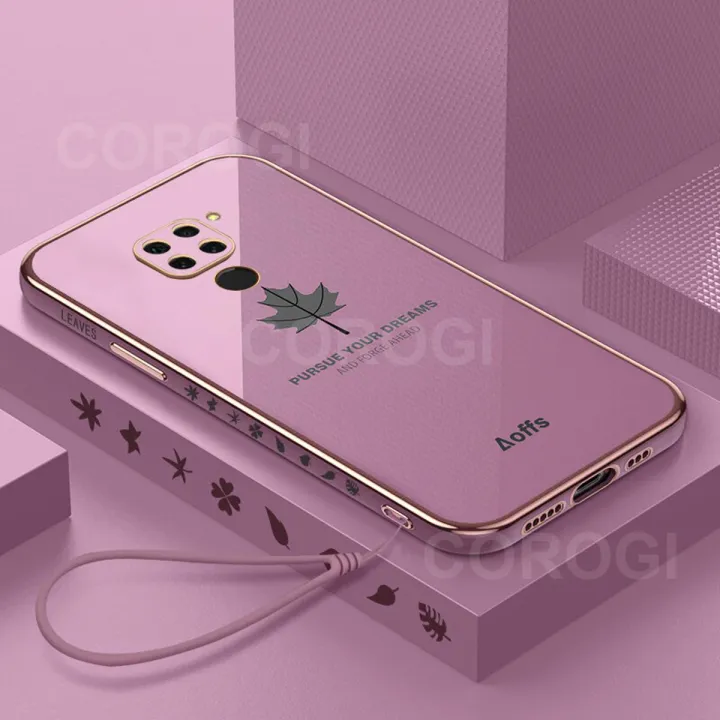 COROGI for Xiaomi Redmi Note 9 Back Cover with Lanyard Luxury Plating Maple Leaf Stylish Fancy Case Soft Silicone Square Mobile Phone Cases Pouch for Girls Boys