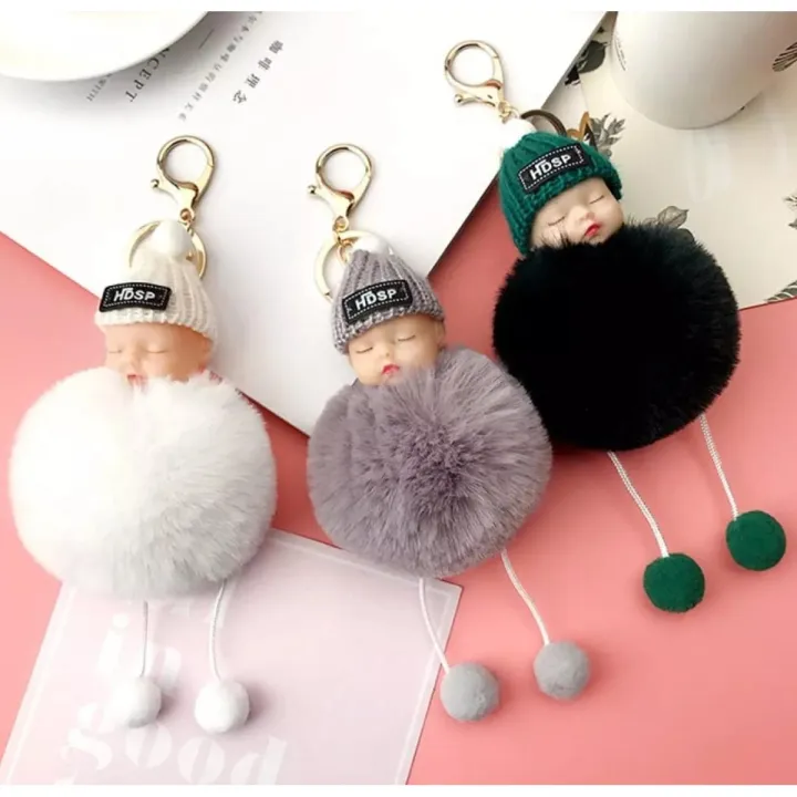 Cute Sleeping Baby Doll Pom Pom Keychain