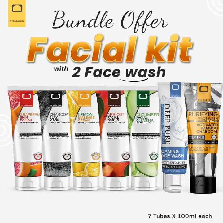 Dermagin Facial Kits (5 Tubes x100ml) with Deep Pure Foaming face Wash 100 ml & Purifying Activated Bamboo Charcoal Face Wash 100ml