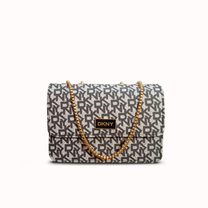 DKNY Shoulder Bag – Elegant Designer Crossbody Handbag with Signature Logo Print, Gold-Tone Chain Strap & Flap Closure – Stylish and Durable PU Leather Purse for Women – Perfect for Casual, Office & Evening Outfits.