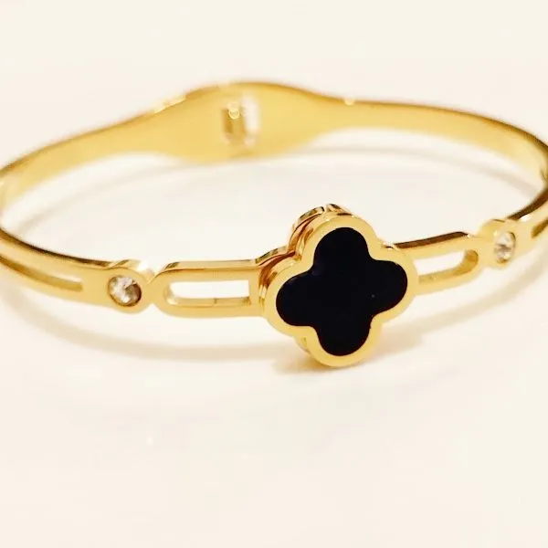 Elegant Gold-Plated Four-Leaf Clover Bangle with Black Enamel and Crystal Accents |stainless steel bracelet -Luxury Jewelry for Women |Best Gift for Girls