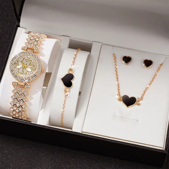 Fashionable 5-Piece Quartz Watch Collection for Women - Petal Gold Timepiece with Elegant Earrings & Necklace Set