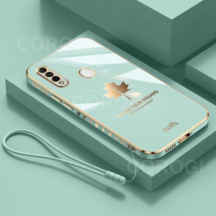 For OPPO A31 Back Cover with Lanyard Fashion Shiny Plating Maple Leaf Design Camera Lens Protection Square Edge Soft Silicone Protective Phone Case