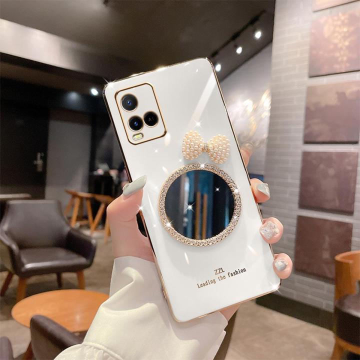 For Vivo Y21 Y21A Y21T Y33s Y33T Back Cover + Bowknot Makeup Mirror Fashion Shiny Plating Square Bumper Bling Girls Phone Case Soft TPU Silicone Shockproof Back Cover