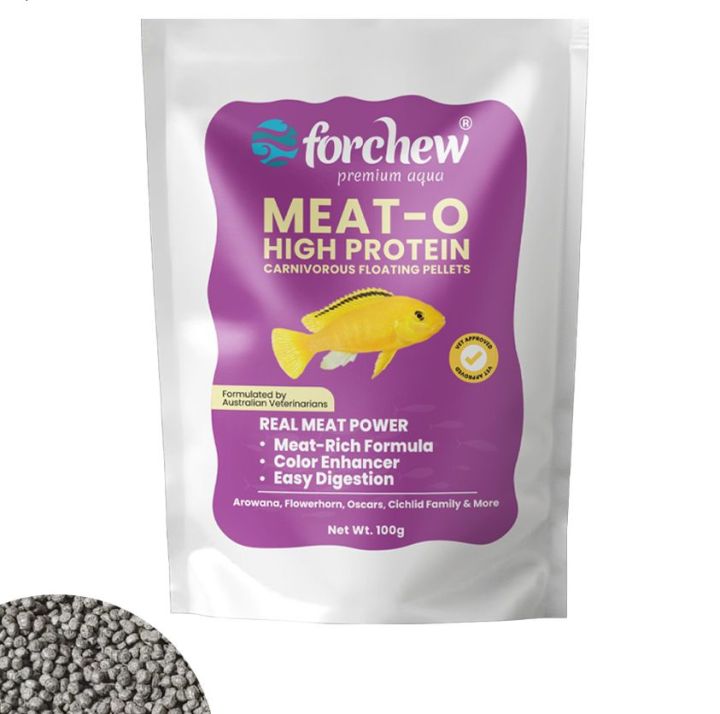 Forchew Premium Meat-O High Protein Carnivore Fish Feed – Floating Pellets with Real Fish Meal Meat for Arowana, Flowerhorn, Oscars & More | 100g & 1kg