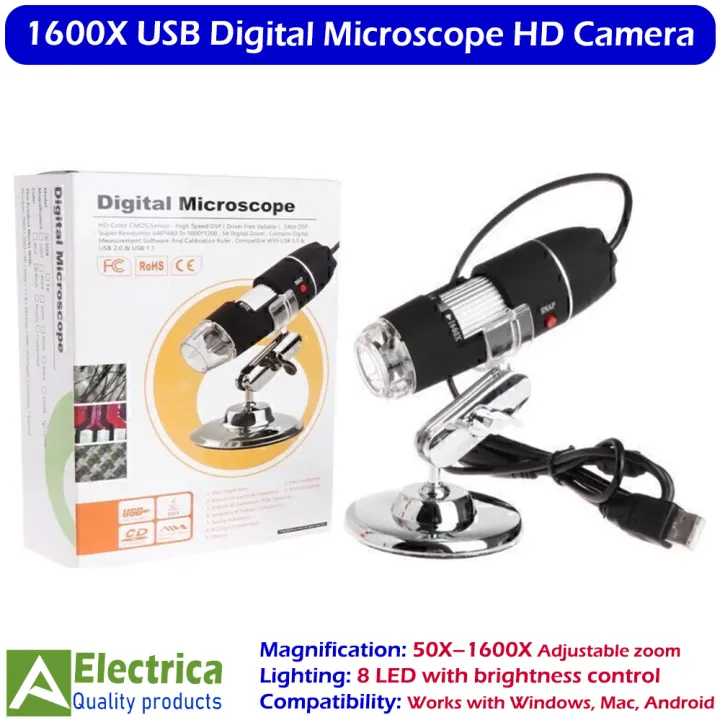 Handheld Digital Microscope 50X–1600X USB with 8LED HD Camera Magnifier Endoscope for Windows, Android, Mac by Electrica