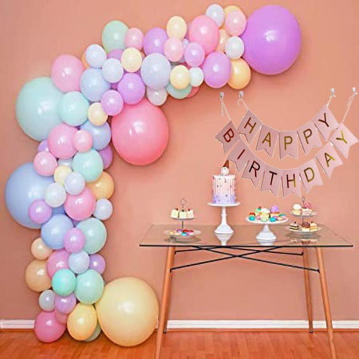 Happy Birthday Cute Macroon Theme With Pink Happy Birthday Banner , Pastal Colors Light Baby Colors Balloons & 5 Jumbo Macroon Balloons All Pastal Colors Theme