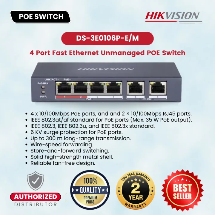 HIKVISION DS-3E0106P-E/M 4 Port Fast Ethernet Unmanaged POE Switch Transmission Network Switches Value Series-Store-and-forward switching-Solid high strength metal shell ethernet switch
