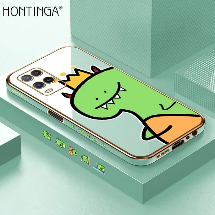 Hontinga for OPPO A54/A54 2021 Back Cover(Free Lanyard)Luxury 6D Plating Cute Crown Dinosaur Side Pattern Case Soft Silicone Square Mobile Cover