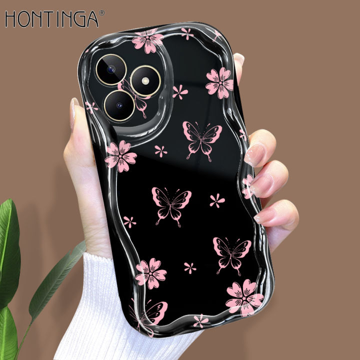 Hontinga for Realme C51 C53 Realme Note 50 Back Cover Pink Butterfly Flowers Phone Case Cream Texture Wavy Edge Soft Mobile Cover
