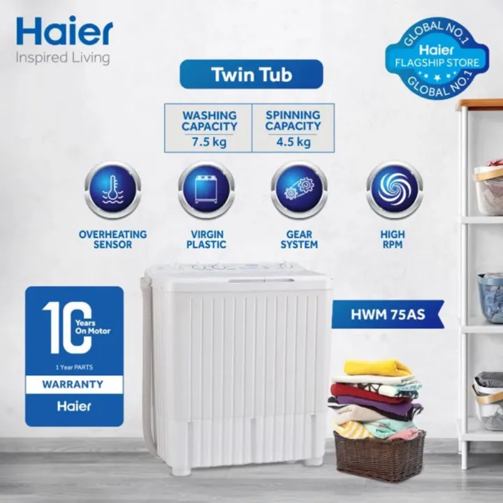 Haier Washing Machine HWM 75AS (7.5KG) Twin Tub with Spinner - 100% Copper