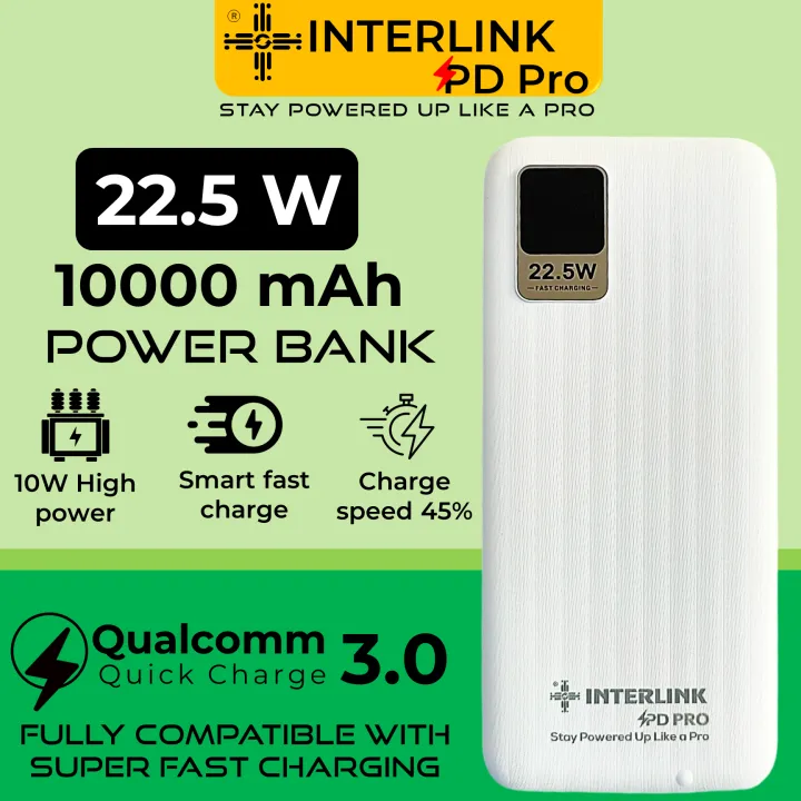 Interlink PD Pro 22.5W 10,000mAh Power Bank | Qualcomm Quick Charge 3.0 | Premium Quality