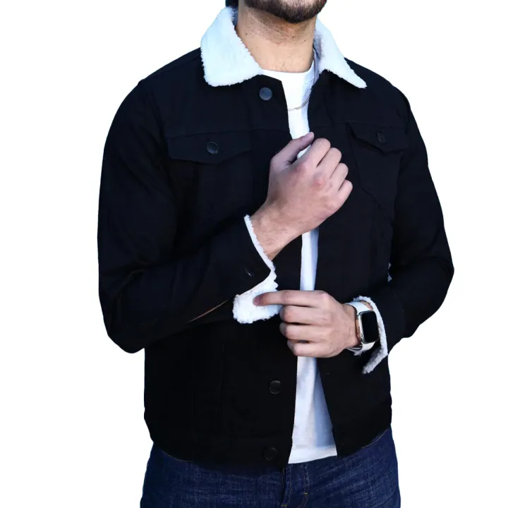 Jet Black Sherpa Denim Jacket with White Fur