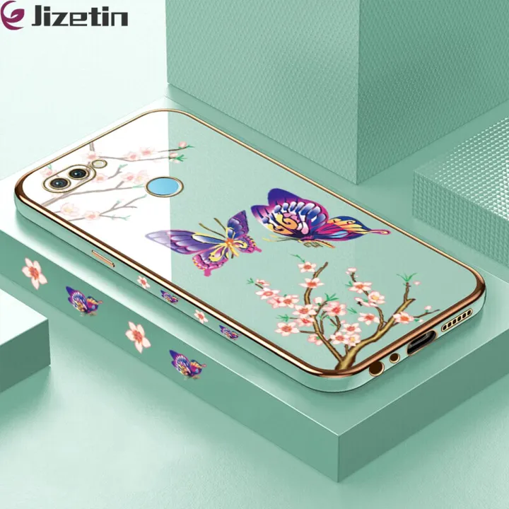 Jizetin (Free Lanyard) for OPPO F9 Realme 2 Pro Back Cover Peach Blossom and Butterfly Luxury 6D Plating Case Side Pattern Soft Silicone Square Mobile Phone Cases