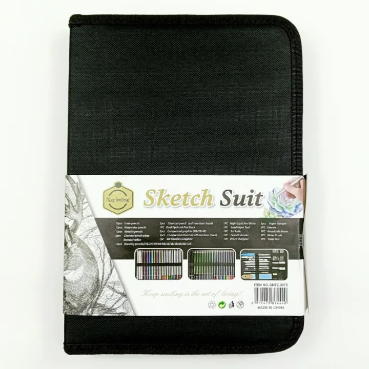 Keep Smiling 75pcs Professional Sketch and Drawing pencils set kit in fabric pouch, Color Pencils Charcoal Pencil blenders erasers paper cutter sketching kit