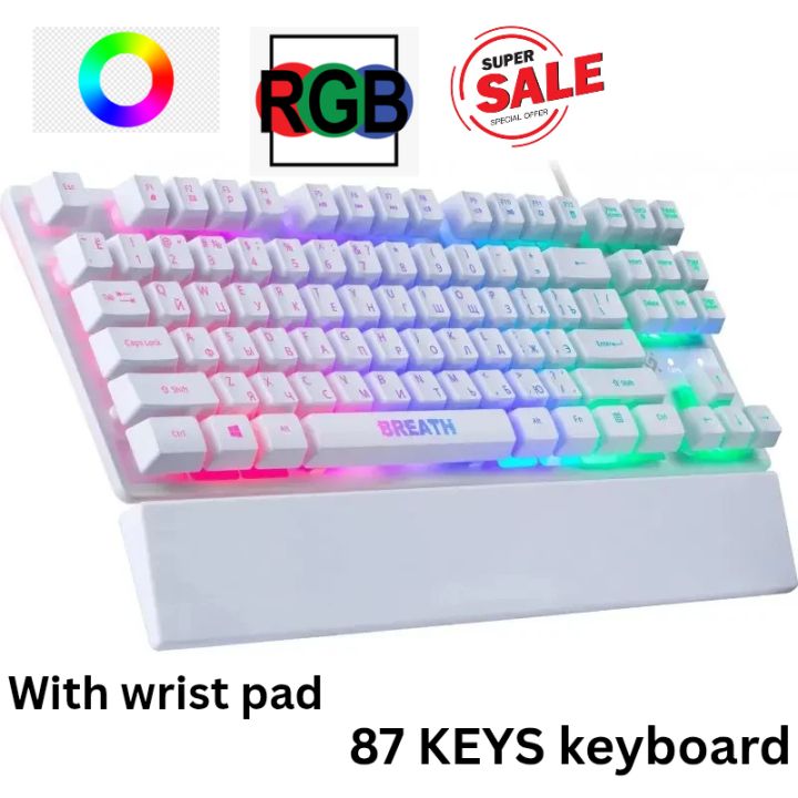 Keyboard backlight usb wired keyboard English USA layout Gaming keyboard defender breath gk-184 RGB wired keyboard with wrist pad for professional, gaming & normal use 87 keys defender breath gk-184 rainbow RGB suitable for gaming best for laptop or pc
