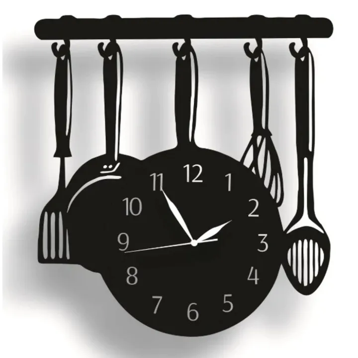 Kitchen wooden wall clockSpoon Fork And Fry Pan Utensils Style Made By Laser Cut Wooden Wall Clock, New Favorite In Modern Home Decor Wall Hanging Decoration In Black and Brown Colour In 16 Inches Size