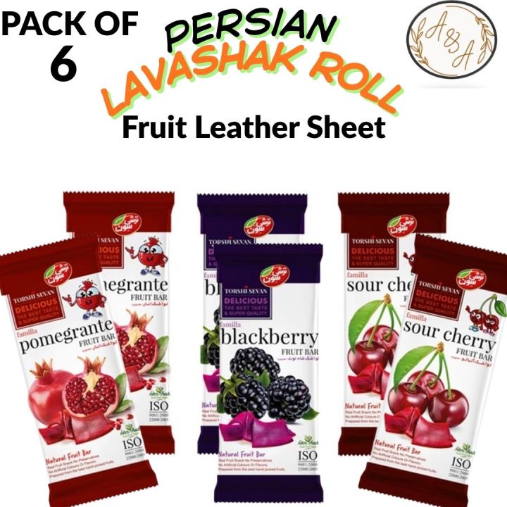 Lavashak Fruit Leather Sheet Roll (Pack of 6) Sour Cherry, Pomegranate and Blackberry Mix, Persian Style Natural Tart Snack Ready To Eat Fruity Bar Imli