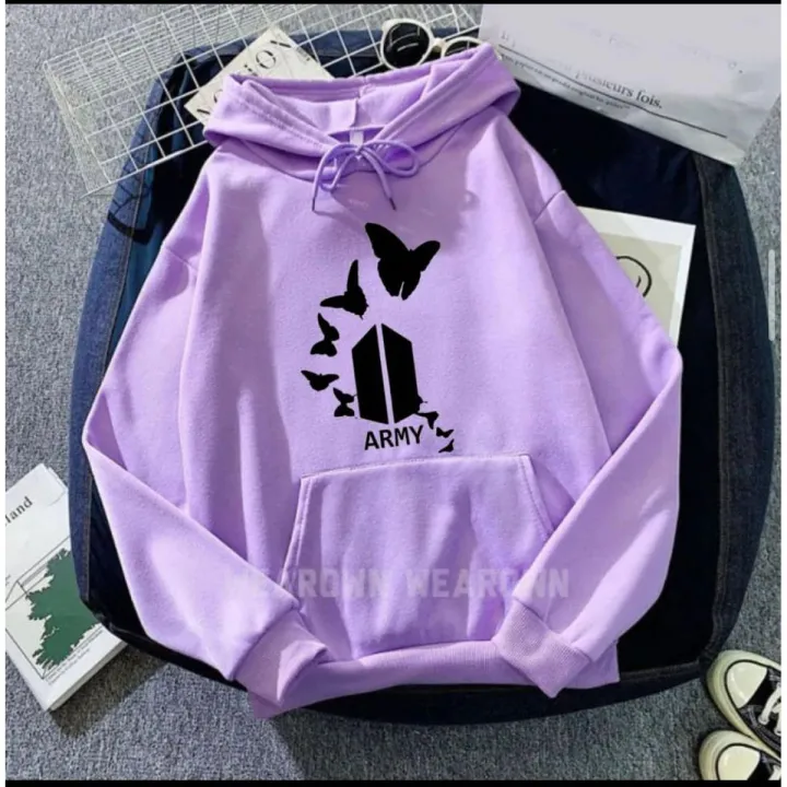 Light Purple Bts Army Printed Fleece Full Sleeves Pull Over Hoodie For Women