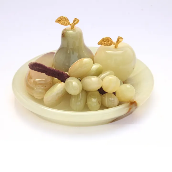 Marble Fruit Tray Set, Hand Crafted Decorative Onyx Round and Leaf Shape Tray with Marble fruits Grape Apple Banana and Pear