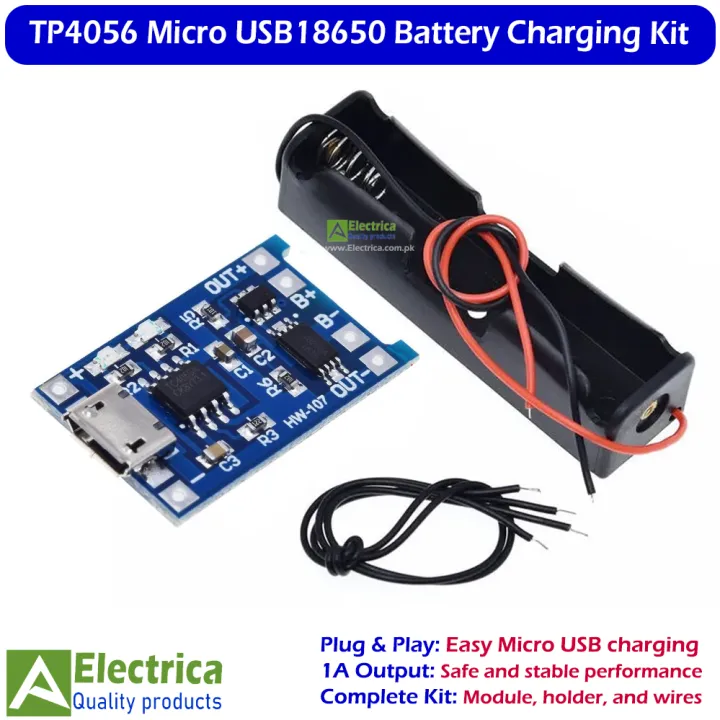 TP4056 Charging Module and 18650 Cell Holder Set with Jumper Wires Micro USB 5V 1A Lithium Battery Charging Kit by Electrica