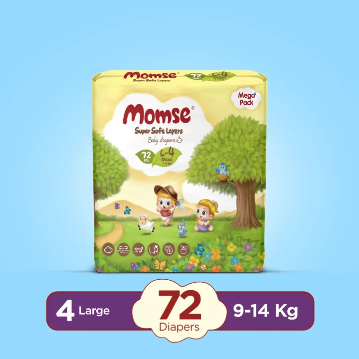 Momse Diapers Mega L Size 4 - 72 PCs - 9 -14 Kg with Free Wipes