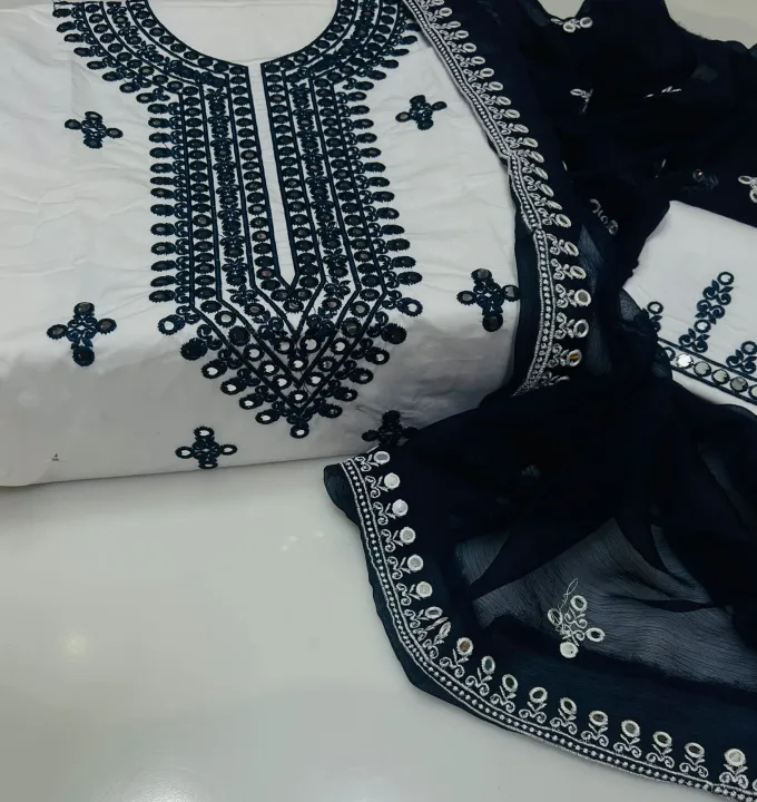 Most Beautiful woman Luxury Dresses Stuff cotton Cross stitch 9 mm embroidery dopatta krincle shafoon 9 mm cross stitch karhai 3 PC