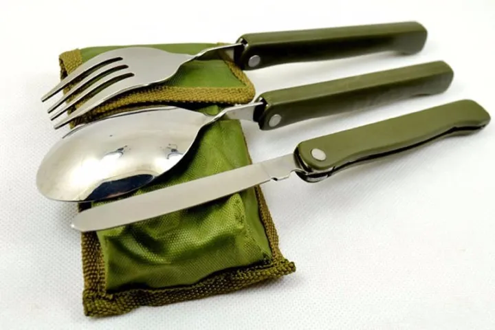 Multifunction Outdoor Tableware,3 in 1 Camping Folding Spoon Fork Knife Portable Cutlery Set with Pounch