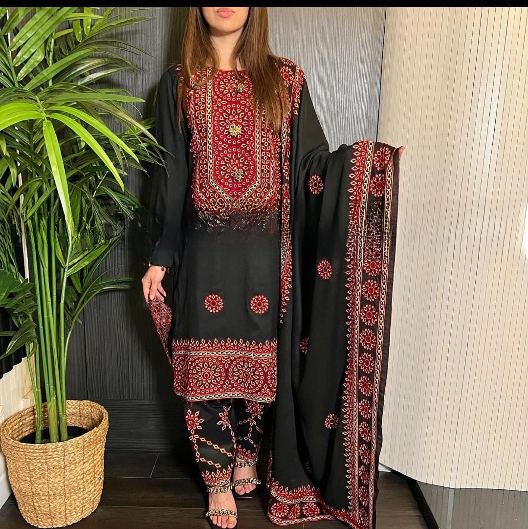 New Summer Arrival – Soft Lawn 3PC Suit | Computer Aari Sindhi Embroidery Shirt, Chiffon Dupatta & Embroidered Trouser